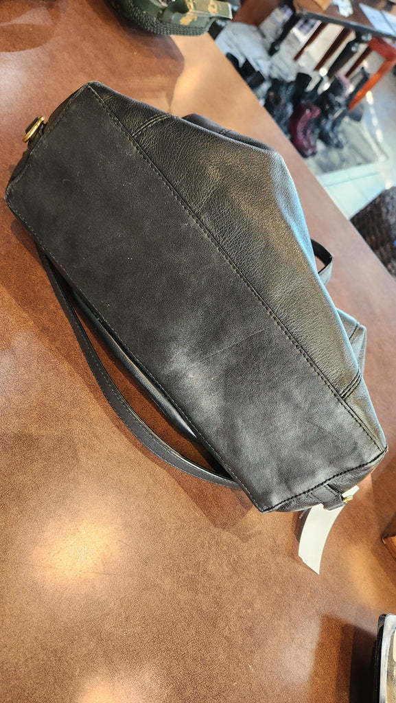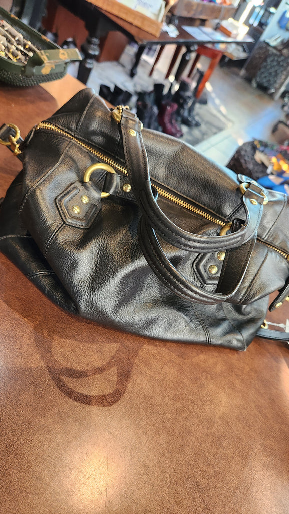 Coach Black Leather Purse with Gold Metal Details. Vintage black bag with two hand handles and a single shoulder handle as well. Looks like a small duffel bag with great accents.