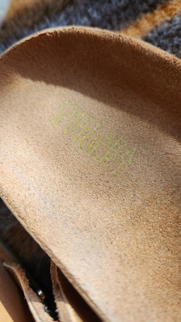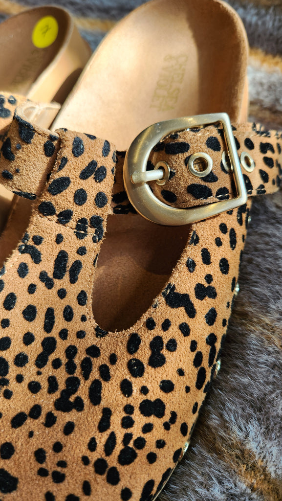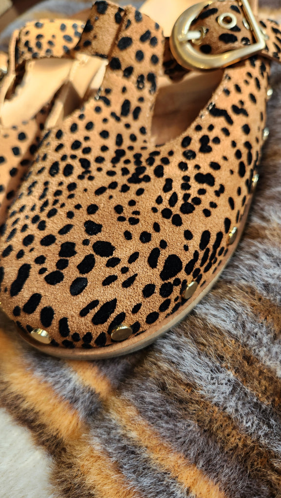Chelsea and Violet Slip on Leopard/Cheetah Print Clog. Hob nailing around the front of the foot as a decorative detail. Also Buckle on top of foot. Leather upper and cushioned.