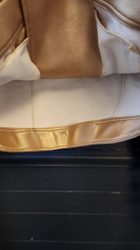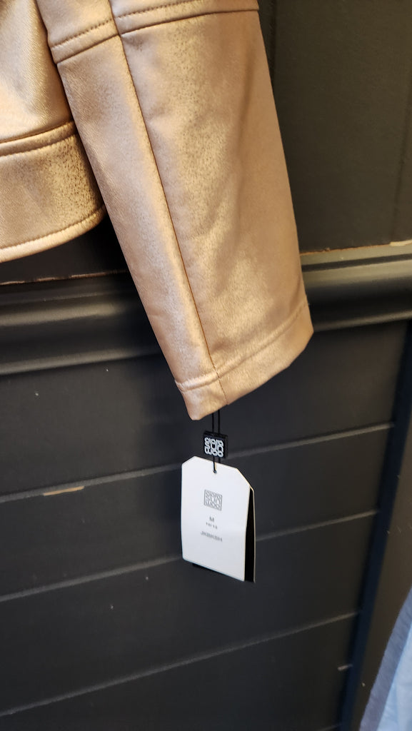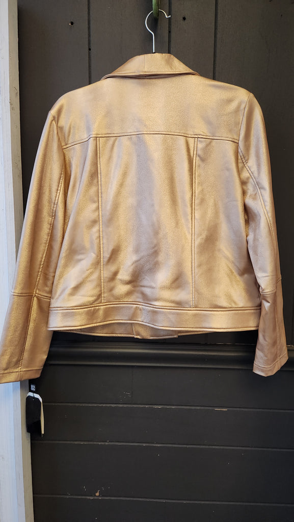 Clara Sun Woo Faux Gold Leather Motorcycle Jacket with gold zipper accents. Side main zipper, gold snaps, zippers at pockets. A very classy gold jacket. Fabric has some give to it and slightly cropped and hangs to cover the stomach.