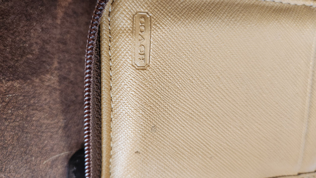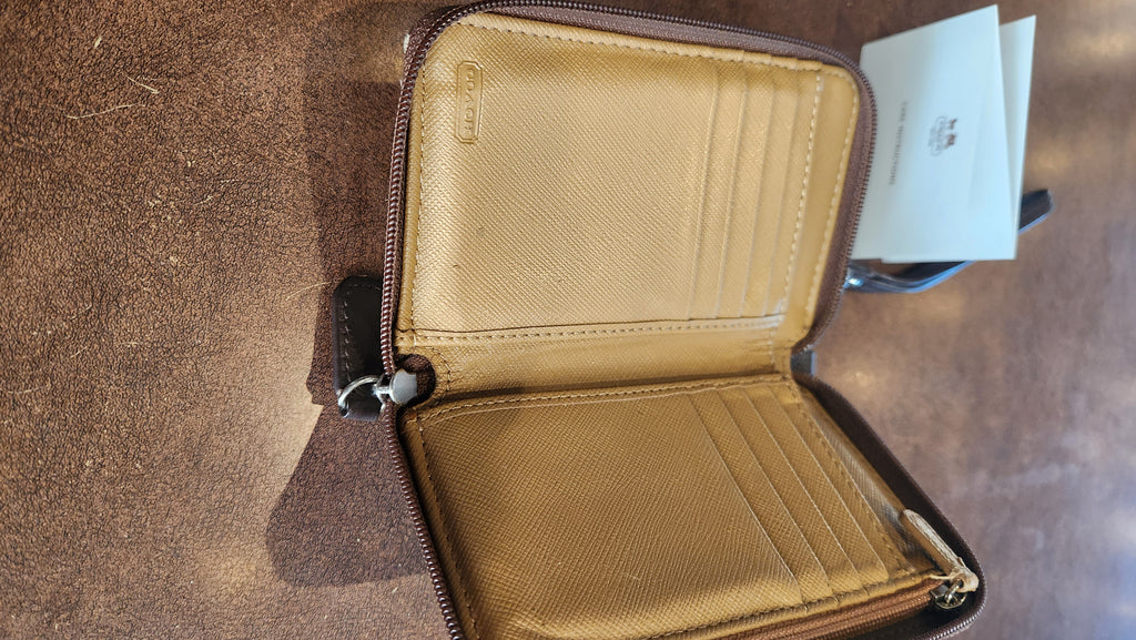 Coach Signature tan canvas credit card Wallet front pocket and wrist strap. Zips around and holds money and credit cards, front buckle pocket too small for anything but change.