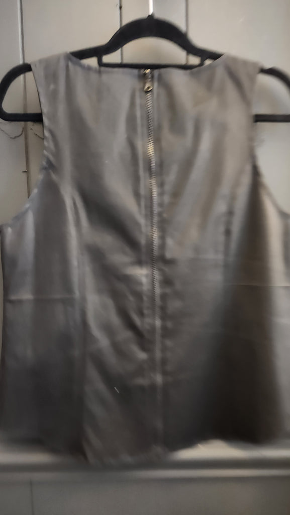 DL Lamb Leather tank top with small meant to be there holes in it. Zipper back all the way down. Small holes cut out on front of leather tank top, material has some give to it. Very chic and Harley at the same time.