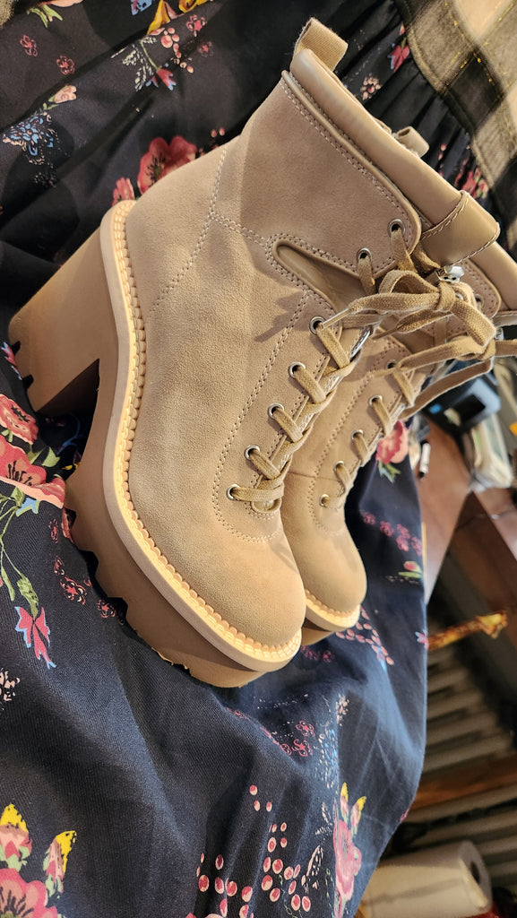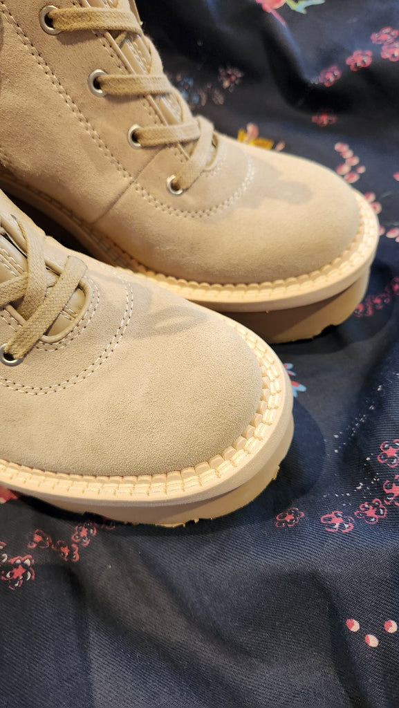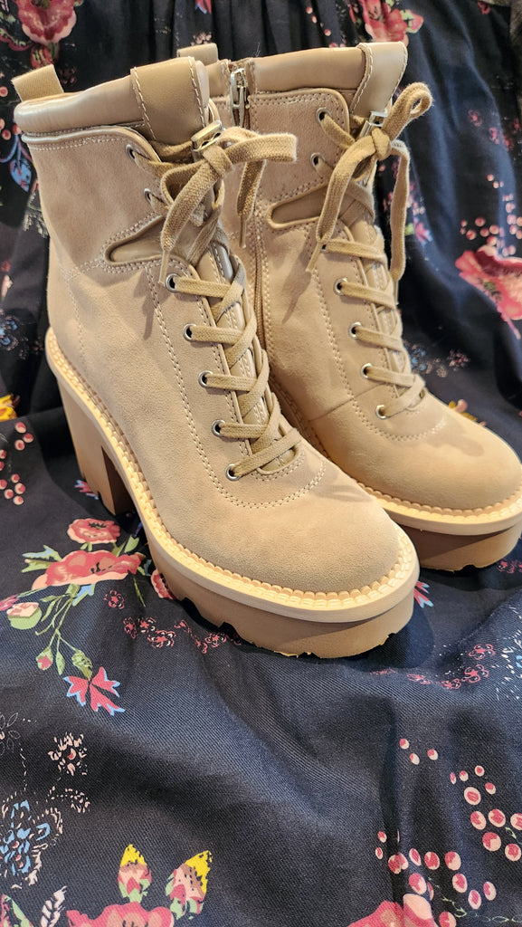Dolce Vita Lug Sole Tan Boots. Lace Up in front but with side zipper for easier access, top stitching design and well constructed, tall but stable. in great shape almost never worn.