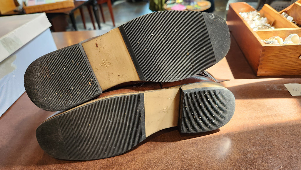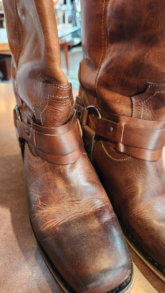 Eddie Bauer Brown Leather Cowboy Boots, come to mid calf, has cool leather strap and ring detail, buckle detail on heel,  pull on and wooden sole.   These are awesome boots with just enough wear on them.