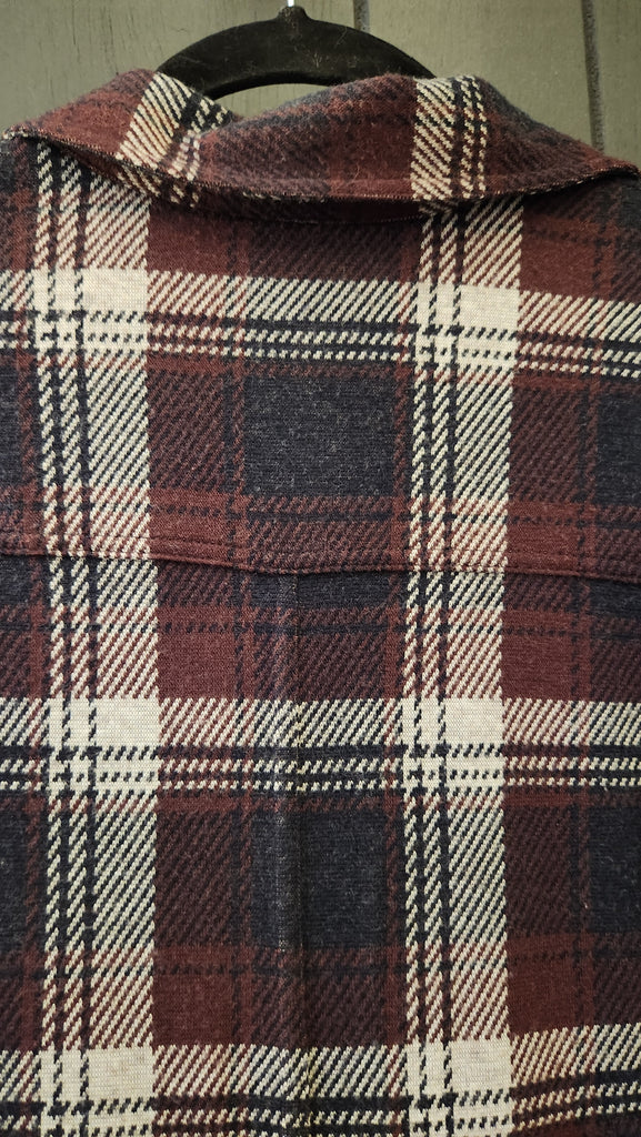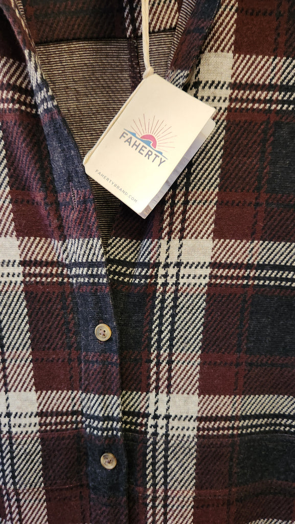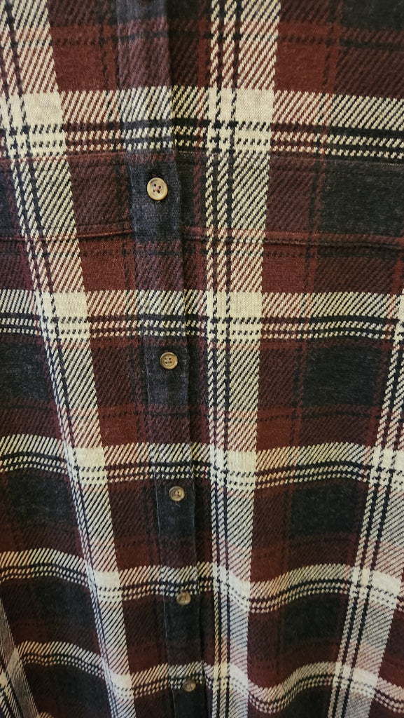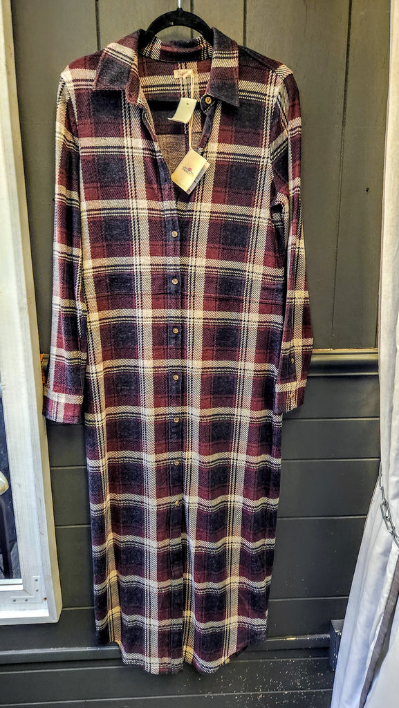 Faherty Long Sleeve Gray and Burgundy Plaid super soft Long Maxi Dress, falls to ankles, button front and great plaid style and colors, so so so soft!