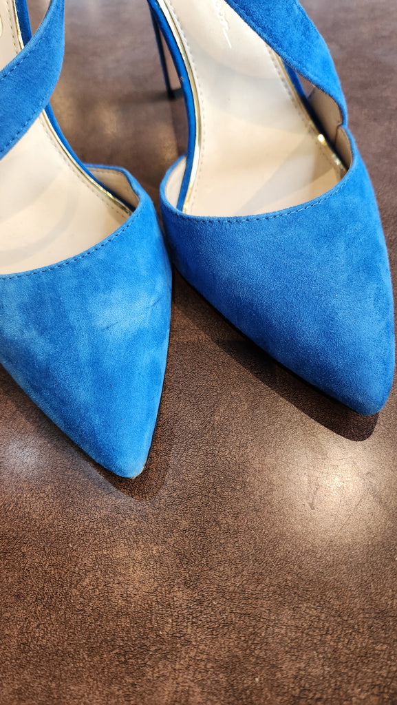 Jessica Simpson Cobalt Blue suede pumps with cross over band at front, tie around the ankle at side. In really good condition for high heel wearers!