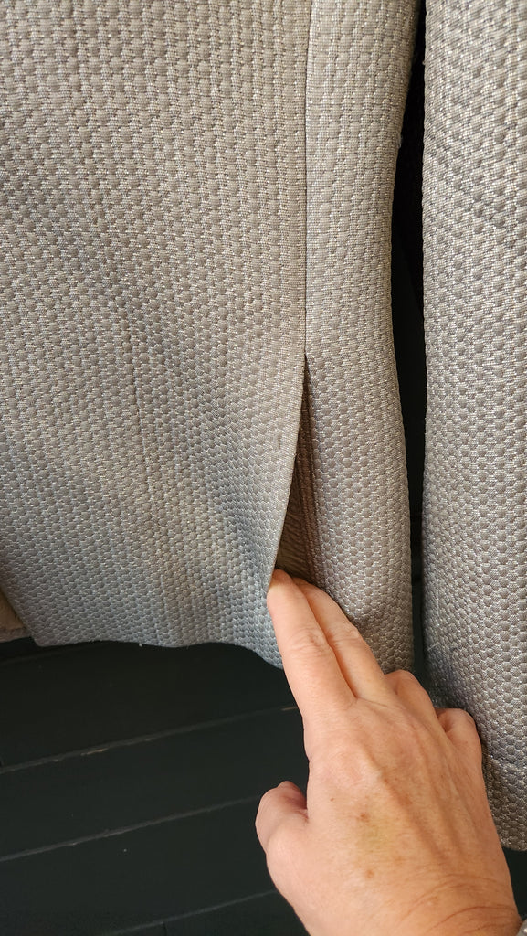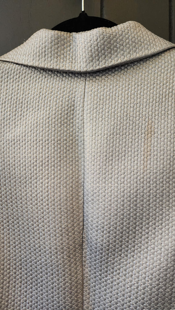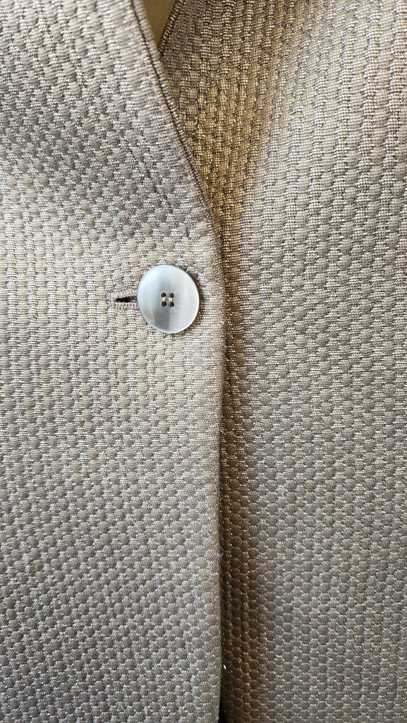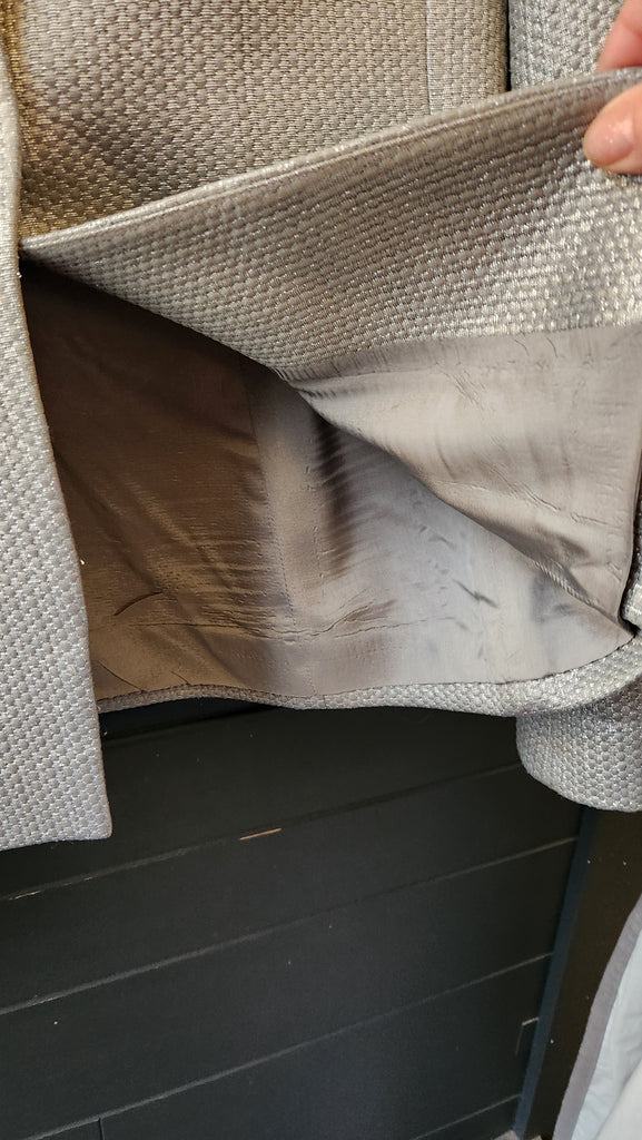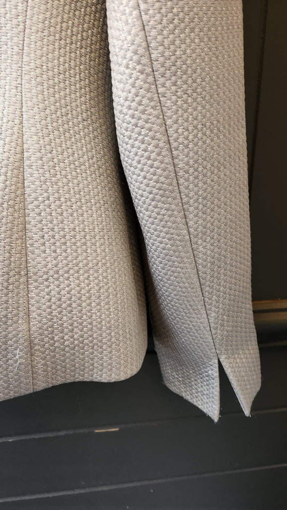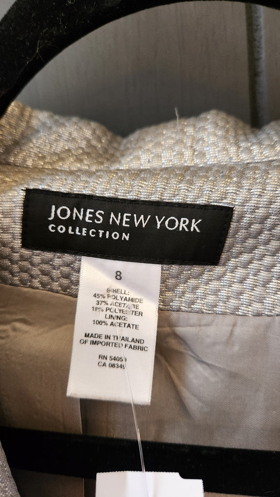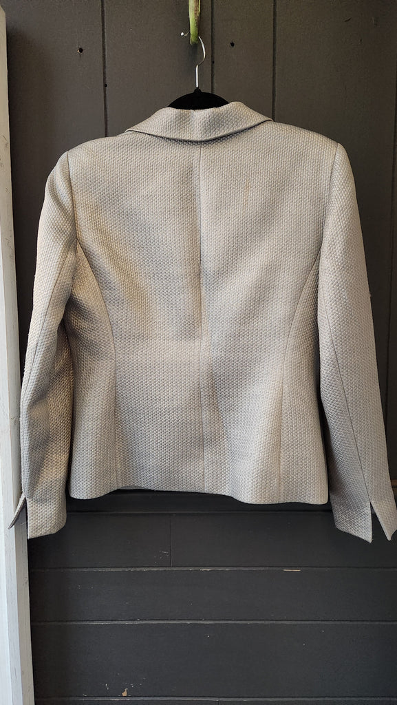 Jones New York Metallic Pewter Blazer.  Single button closure, pockets, material has a weave to it, slightly cropped but covers stomach   and it's in excellent condition.
