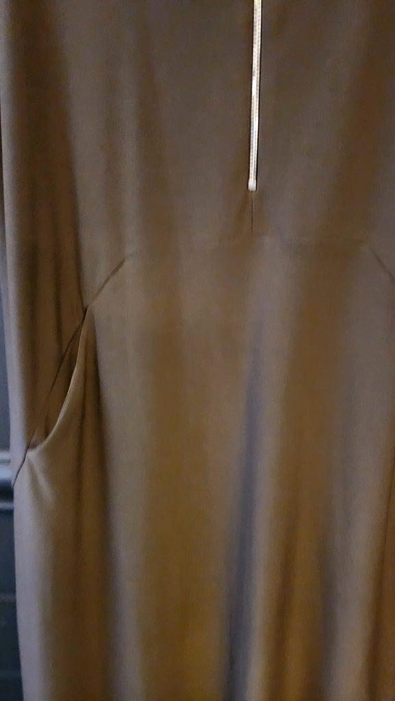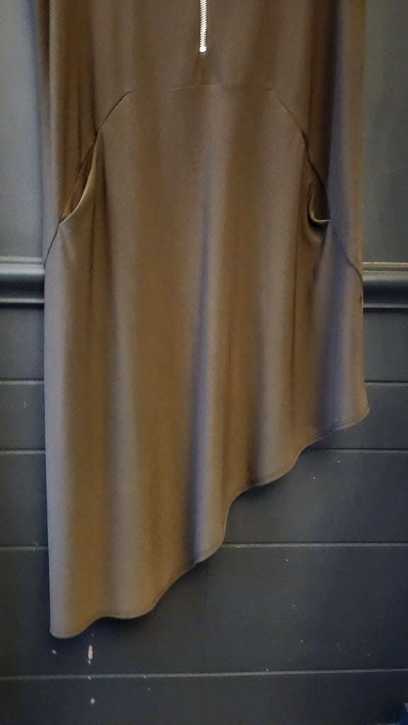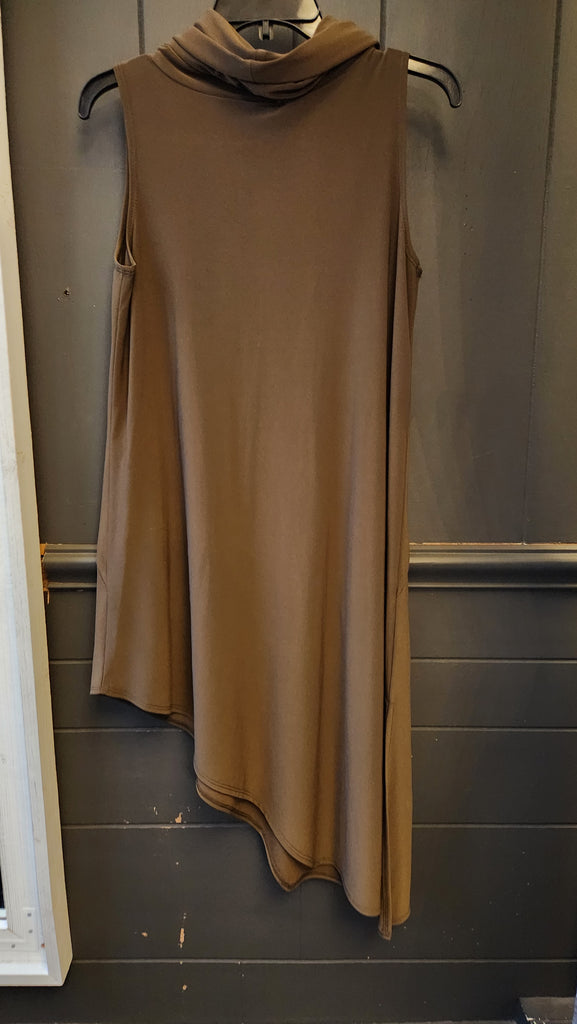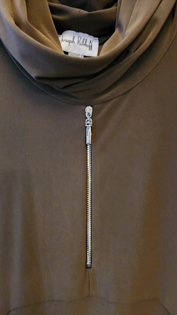 Joseph Ribkoff Sleeveless Mocha Brown Cowl neck Knit Top with Asymetrical Hem.  Gold Zipper on the Bodice and two pockets, slips on over head and the hem falls from mid thigh on one side to mid calf on the other.   The knit material has some give to it.