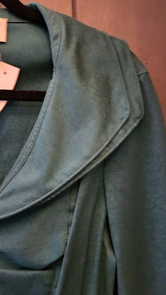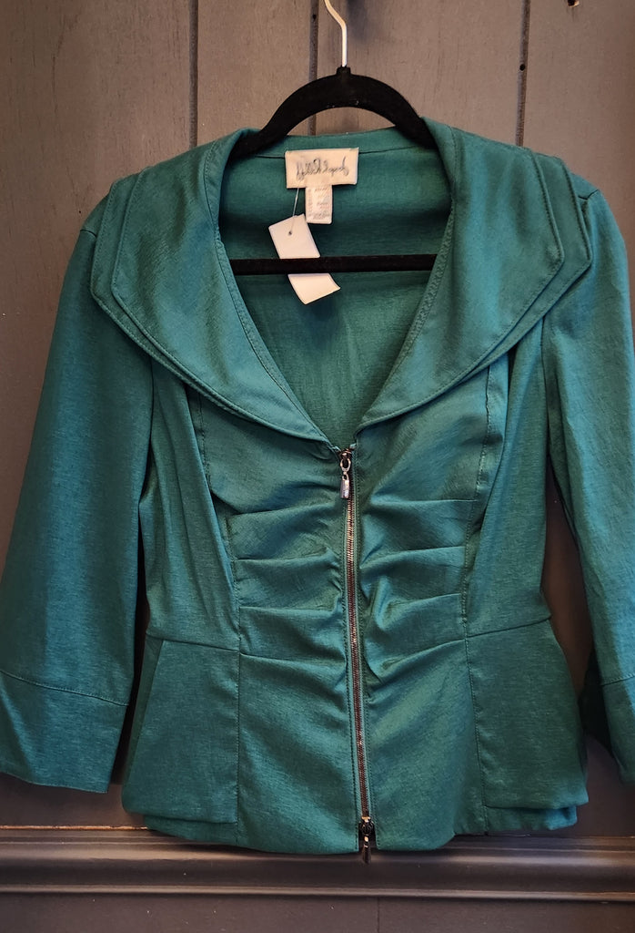Jospeh Ribkoff Ruched Front Green Blazer with 3/4 sleeves and slight peplum hem.   Beautifully constructed with fitted ruching in the midriff area and covers stomach,  there is some give to the fabric.     Large Curved Double Collar with moldable wire inside.