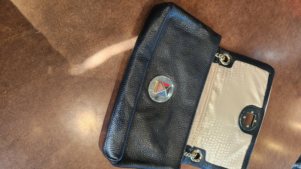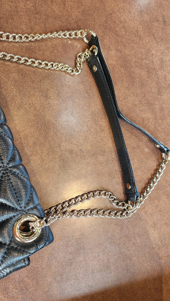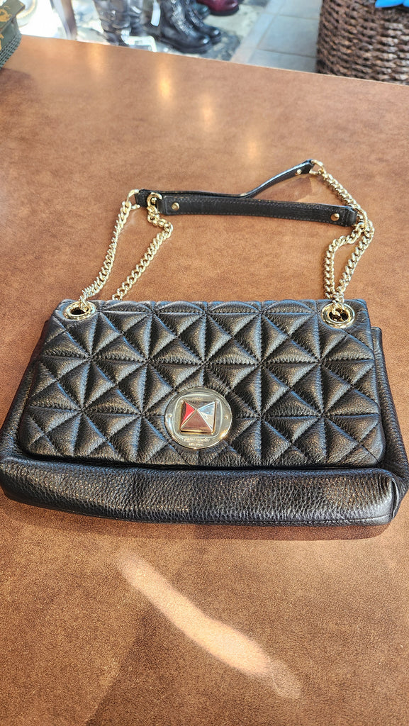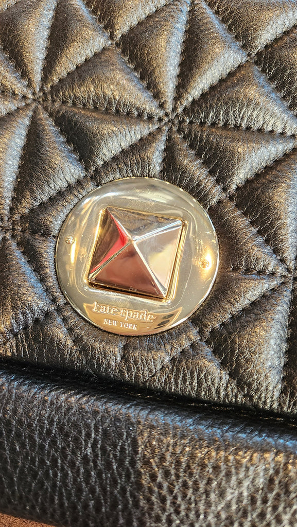 Kate Spade Black Quilted Leather Purse with metallic sheen. Gold accents and gold chain and leather shoulder straps. Pyramid Shaped Lock Button on Purse fold over, pretty Kate Spade gold lining.