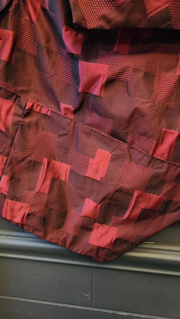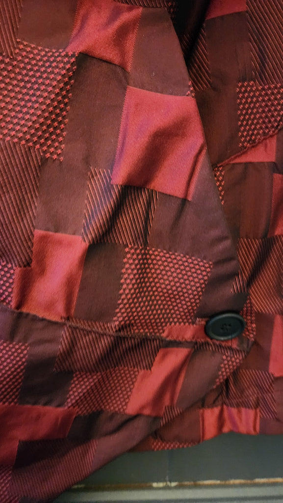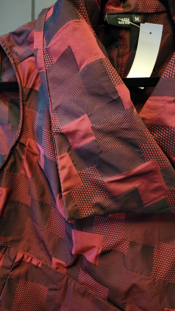 Lisa Bayne Black And Burgundy Abstract Buffalo Plaid and Asymetrical Hemline Vest. Hem comes to a slight point in the front and rounded in the back. 2 Button closure and Will cover stomach and has a beautiful Shawl Style Collar. A unique and fun piece. LIKE NEW