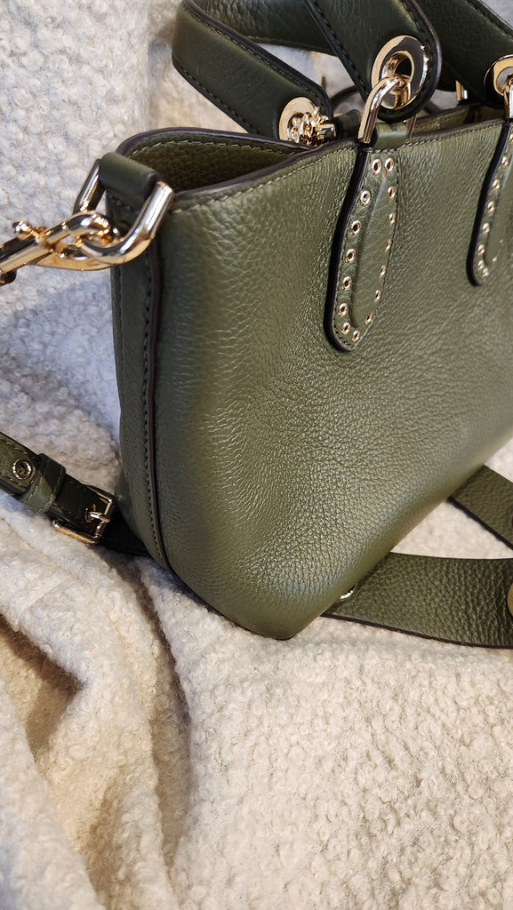 Michael Kors Olive Green Leather Purse with Great Tassel.   Purse has both handles and crossbody strap, with beautiful shiny gold details.  Interior pockets,  Snap closure and crossbody strap can be removed, has feet on the bottom.     Very elegant bag!