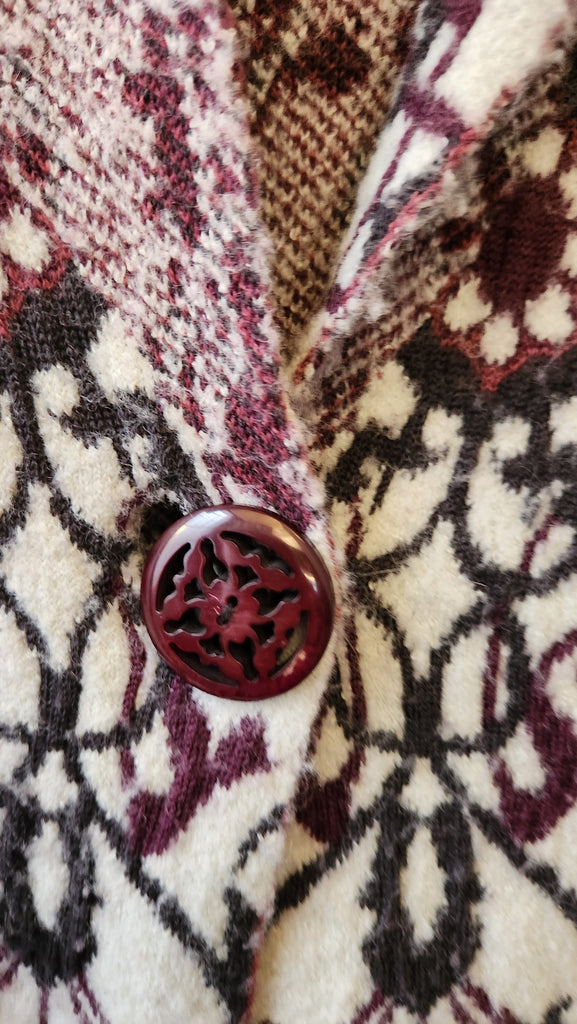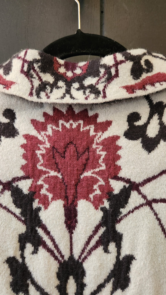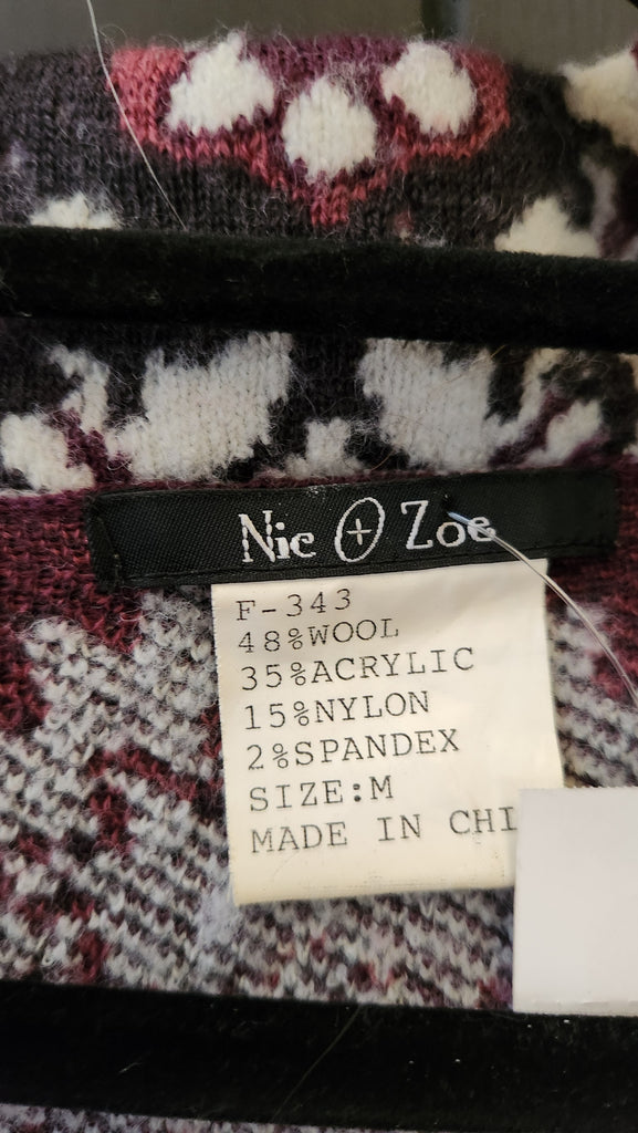 Nic & Zoe Floral Wool Blend Gray and Plum floral Single Button Sweater. Pretty collar, deep V neck, single button fastener, long cuffed sleeves, covers stomach.