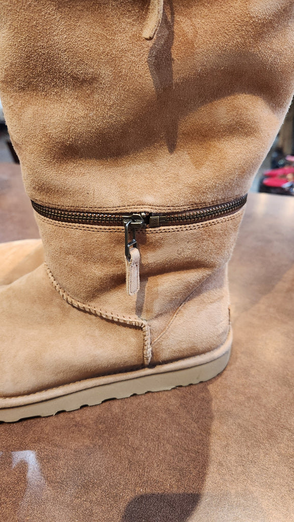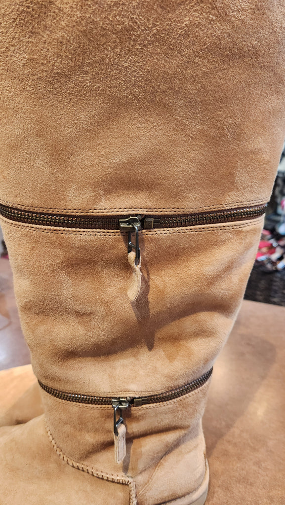 Three boots in one…. wear it as a Mini, Short, or Tall!! The Classic Ultra Tall style features a convertible shaft with zip-off sections so you can wear it your way!! Lined in the cozy UGG plush wool blend, it offers the same signature feel with more versatility and wearing occasions than ever before. • suede upper • Overlock stitch detailing on seams • Convertible zip-off shaft heights • Functional shaft zippers • 10mm UGG plush 80% upcycled wool, 20% lyocell lining • 17mm UGG plush 80% upcycled wool, 20% lyocell sockliner • EVA outsole • Polyester binding • 26" shaft height • Leather heel label with embossed UGG logo