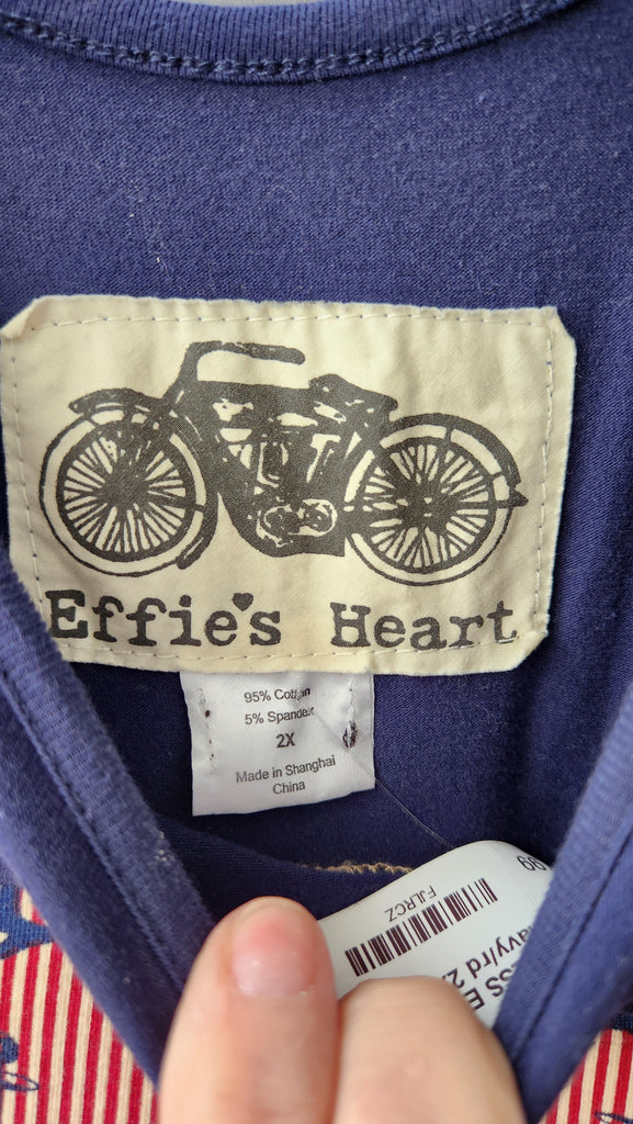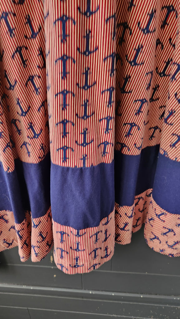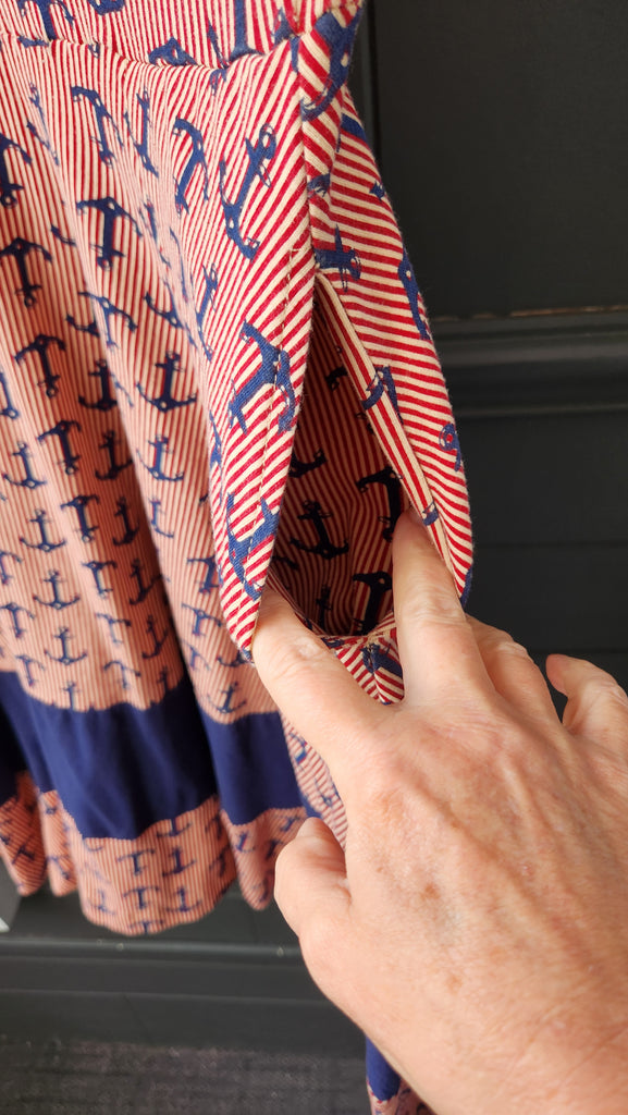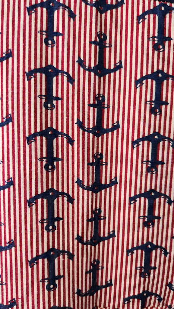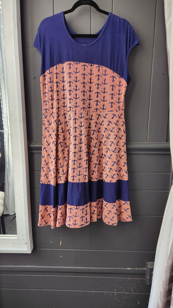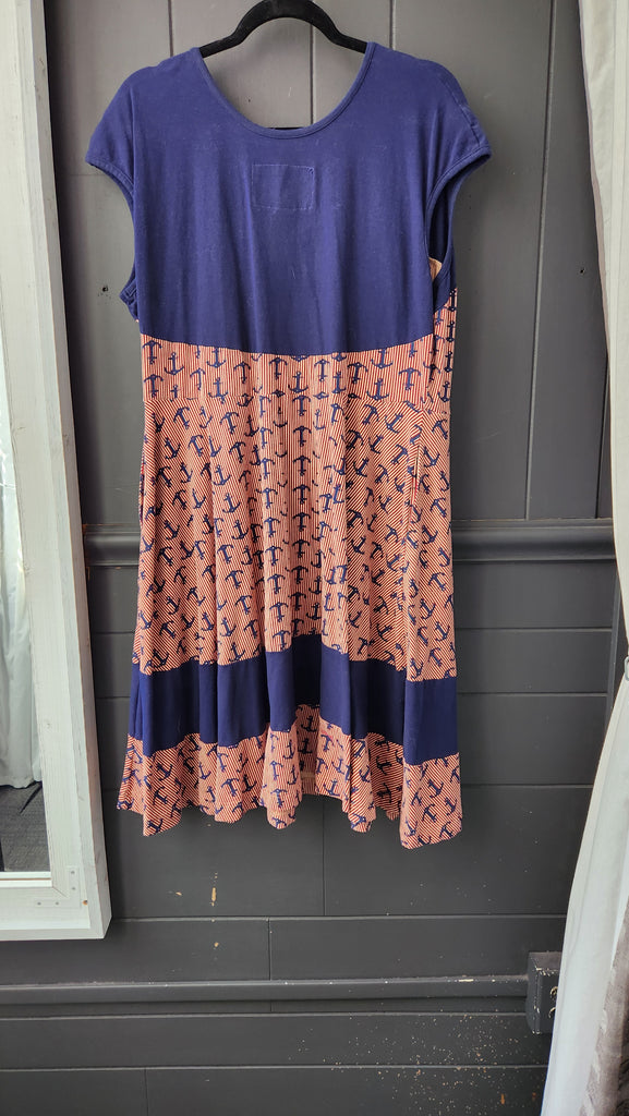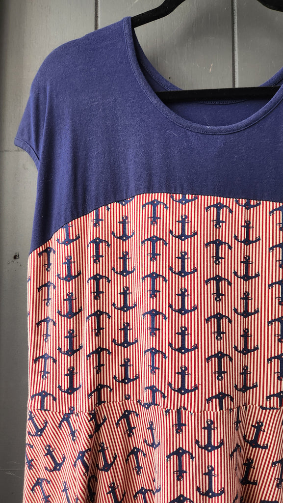 Effie's Heart Short Sleeve Red and Blue Anchors Dress, slight cap sleeve, pockets, falls to just below the knee. Material has give and Has a solid navy top and band of navy near dress hemline. A perfect summer celebration dress!