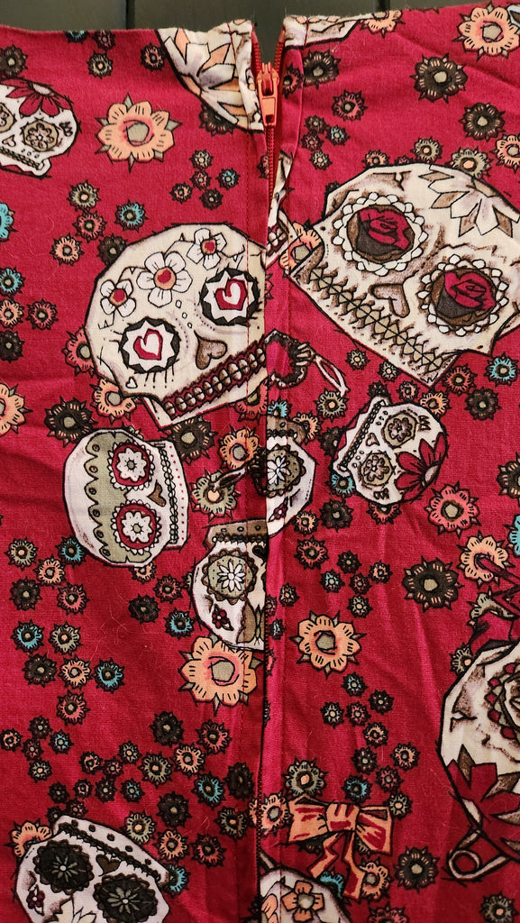 Hell Bunny Sugar Skulls Dress on a deep red background. Great dress with darts and pleats and the prettiest cap sleeves. Zipper back, Deep V Neck, pockets and skirt swings to below the knee. Nice cotton material with the slightest bit of give.