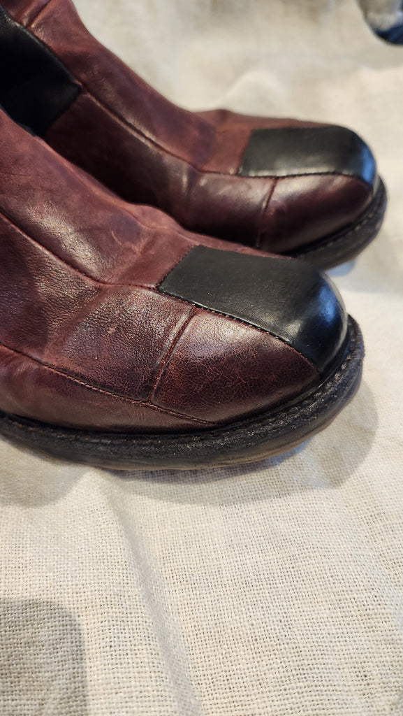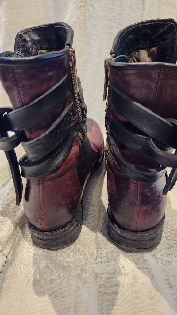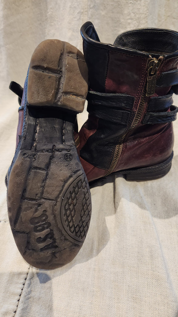 A.S. 98 Black and Deep Red Patchwork Boots. a pleasing patchwork makes these boots pretty cool. Side Zipper detail, some foot bed cushioning, decorative leather straps and buckle. Come up to above the ankle.