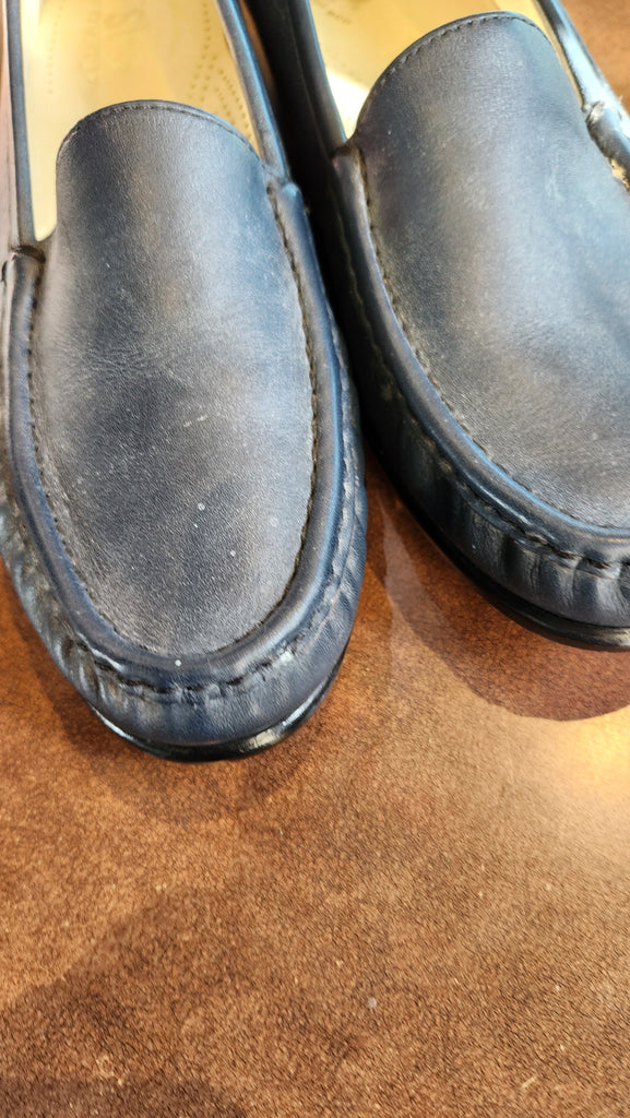 SAS Navy Blue Flat Loafers, cushioning on the inside and flat sloped non skid bottom.   A Classic addition to a Navy wardrobe. Like new