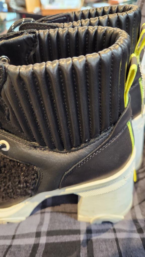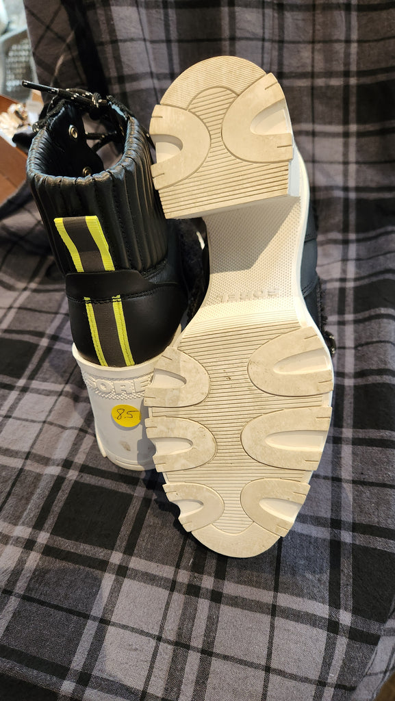 Sorel BREX Heel Cozy Boot Women's Black Chunky Lug Sole Leather Fleece Lace. BREX Chunky Lug Sole, Heeled, Lace Up Ankle Boot Black Leather and Fleece, man-made White sole Get Fall and winter ready with a new pair of Sorel Boots! Fall, winter, rain, snow, ice, cold, fleece lined, cozy, cute, warm.