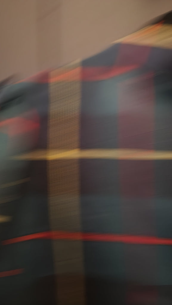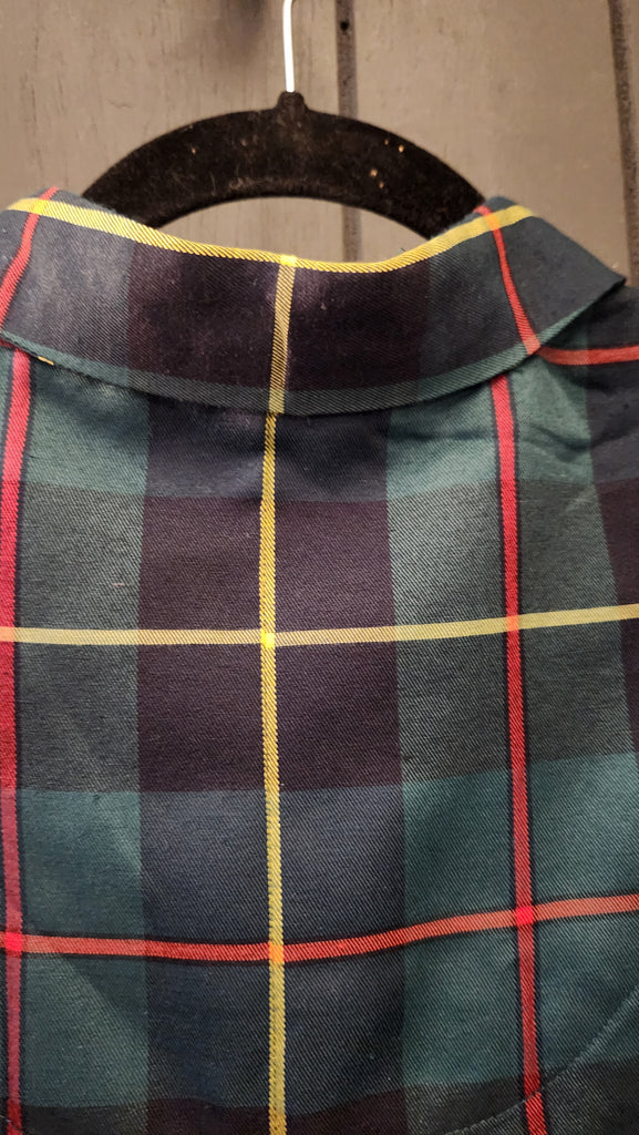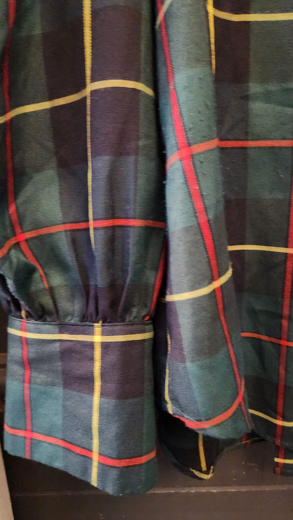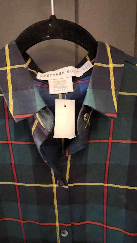 Gretchen Scott Long Sleeve Green Plaid Top. A very pretty and classic green red and yellow check pattern top. Pretty buttons up, puff at the sleeve, back flap, covers stomach.