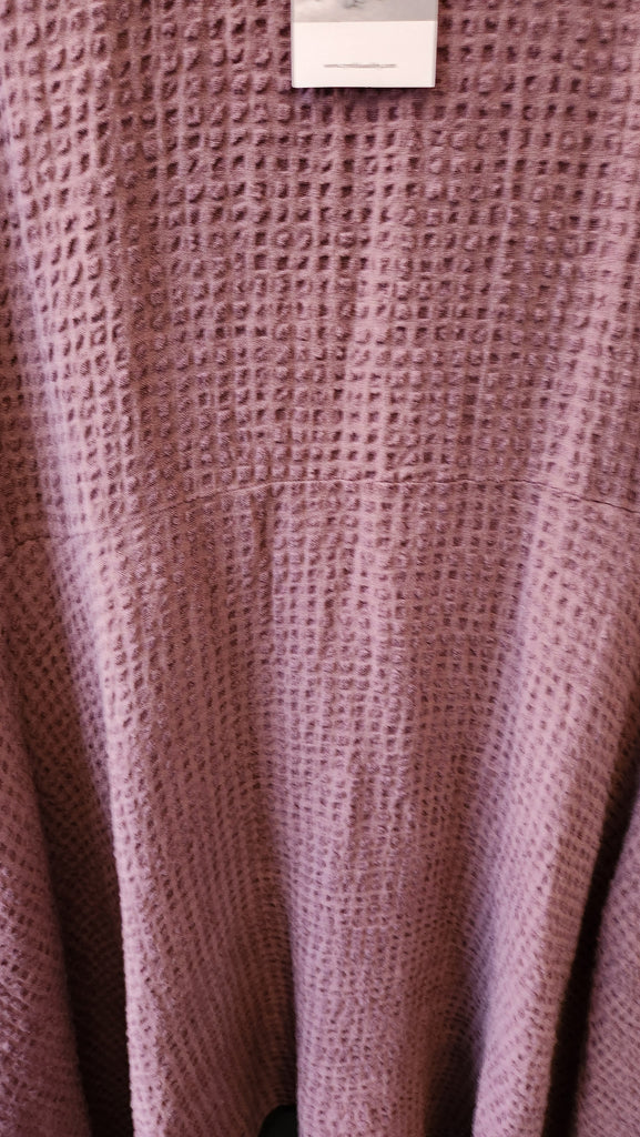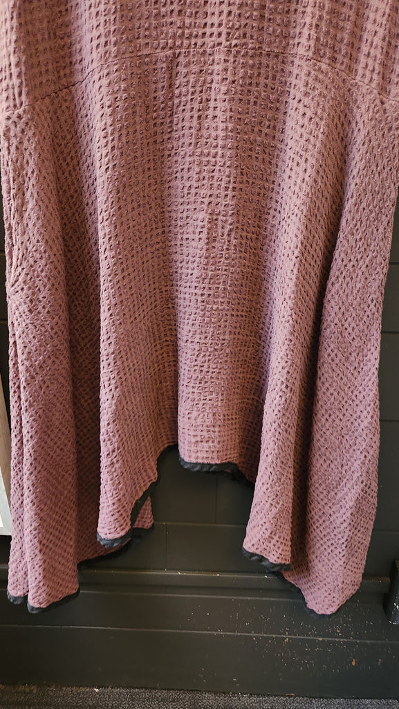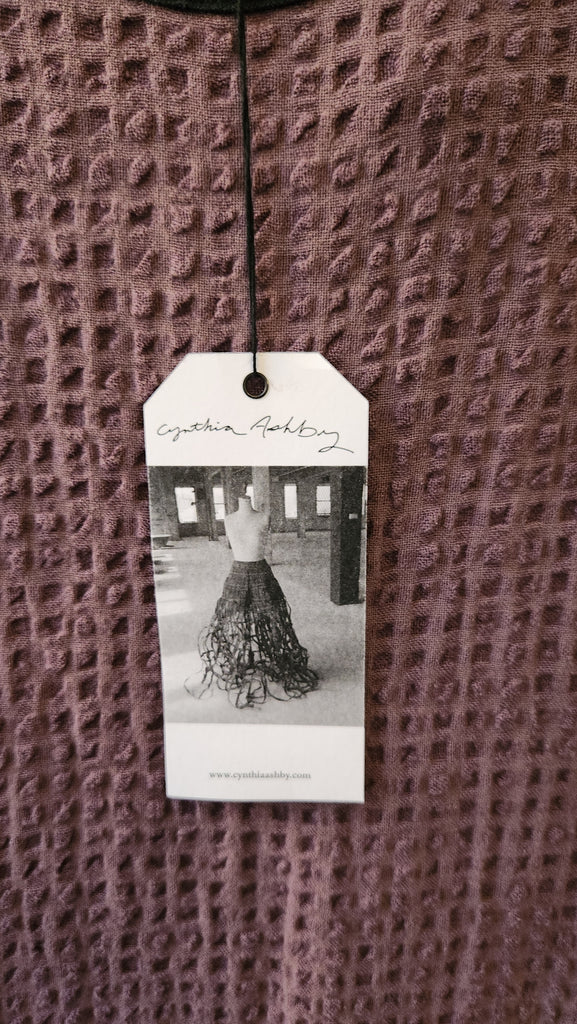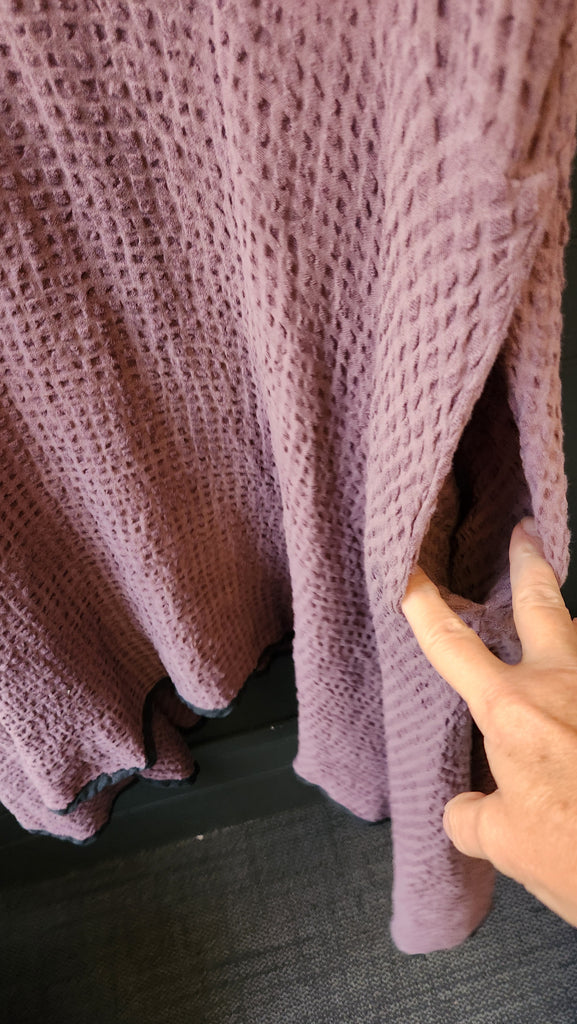 Cynthia Ashby Sleeveless Purple Gauzy Waffle Fabric Dress with Black Piping around neckline, arms and hemline. Drop waist and Beautiful hemline hi in front and back and low on the sides, falls from mid calf to the tops of shoes.