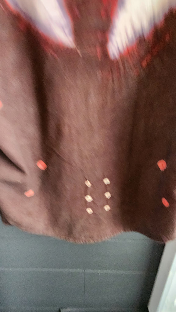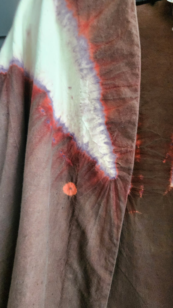 Eleven Eleven Brown Cotton Tie Dye Blazer with white red and purple accents dyes. Drop shoulder and Hangs open and has a wonderful tie dye pattern around the collar and back. hangs open to below the top of thighs. 100 percent cotton and very visually arresting blazer.