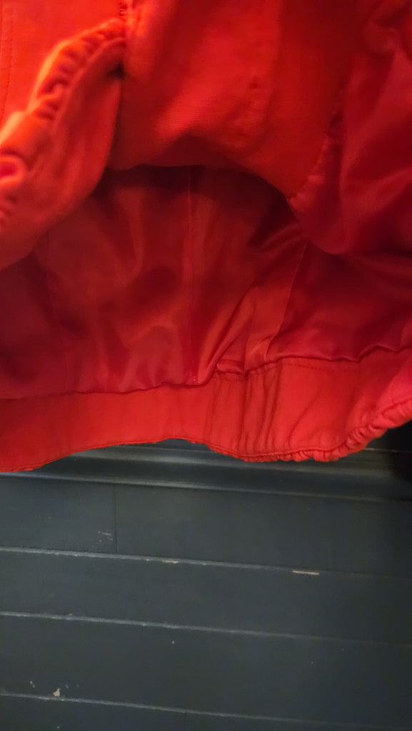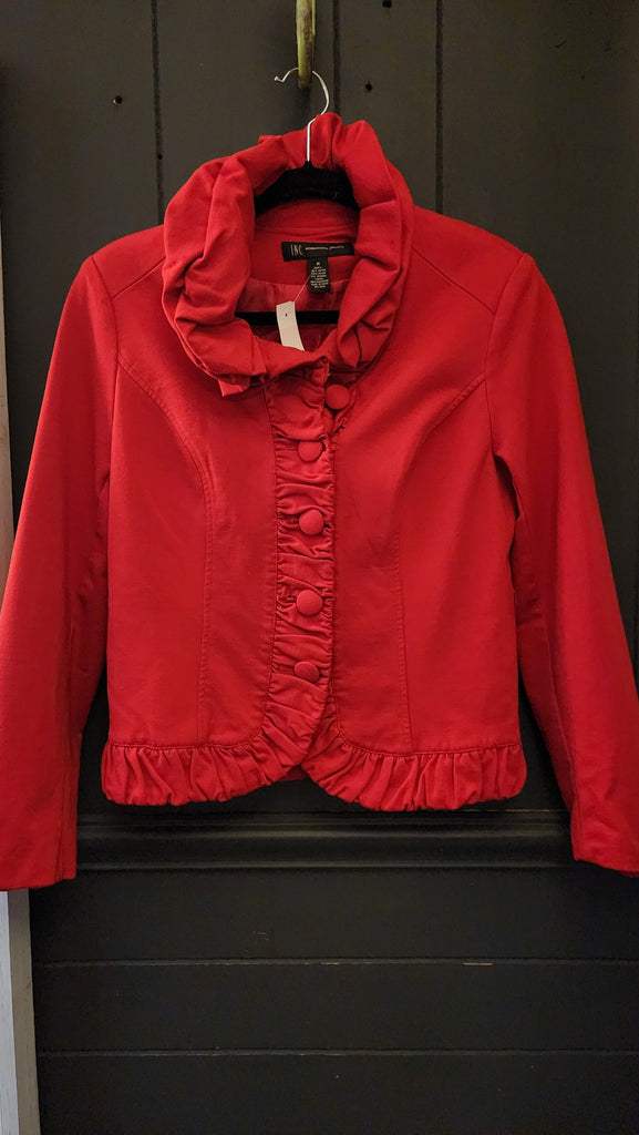 INC Red Ruffle Blazer. A Red Blazer with a beautiful and fun and pretty ruffle around neckline, down front of blazer and on the hemline. Confident and feminine at the same time. 5 fabric covered buttons, fully lined, pockets, fabric has some give but mostly fitted. Covers stomach but is a bit cropped.