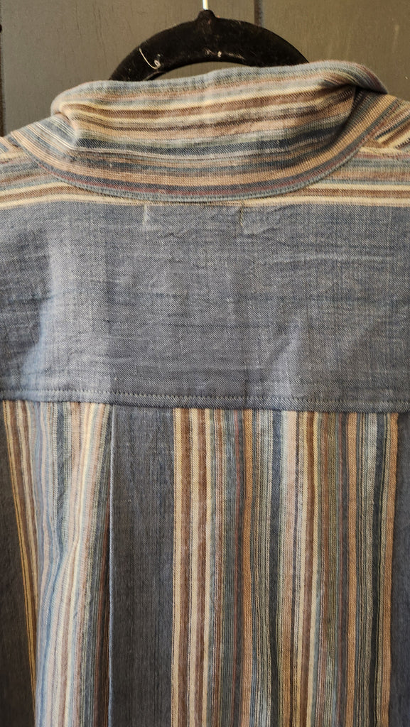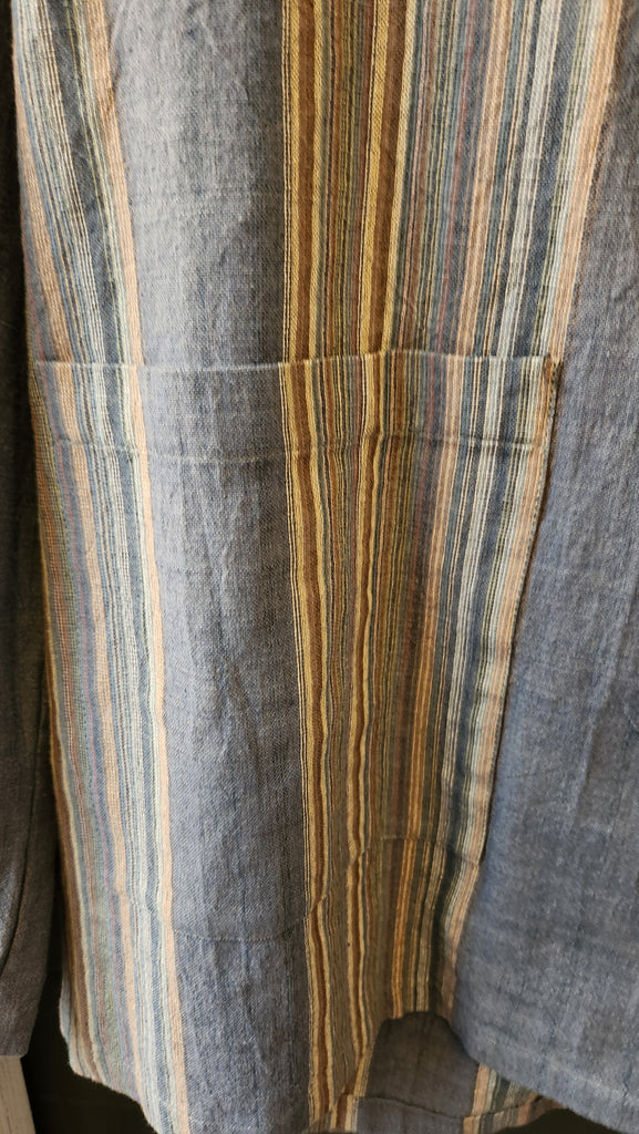 Yasuko Kurisaka Handwoven Blue Stripe Blazer Top, front buttons and single patch pocket that lines up with the stripes, hangs to mid thigh. Beautiful and Quality Piece of Clothing.
